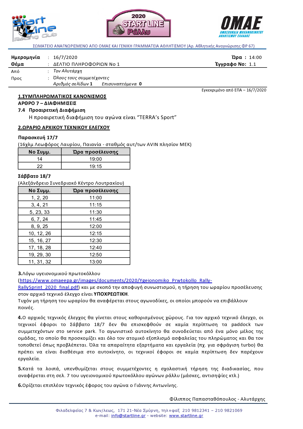 Παρακάτω μπορείτε να βρείτε το Δελτίο Πληροφοριών Νο 1, για το START LINE ΡΑΛΛΥ που διεξάγεται στις 18 Ιουλίου.