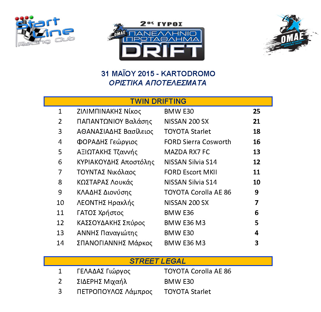 Με τα εντυπωσιακά περάσματα από όλους τους οδηγούς που μετείχαν στον αγώνα, αλλά και με τις πολύ καλές δηλώσεις τους για τον νέο χώρο στο Κρατικό ΚΤΕΟ Νέας Περάμου, ολοκληρώθηκε ο πρώτος αγώνας DRIFT για το 2015.