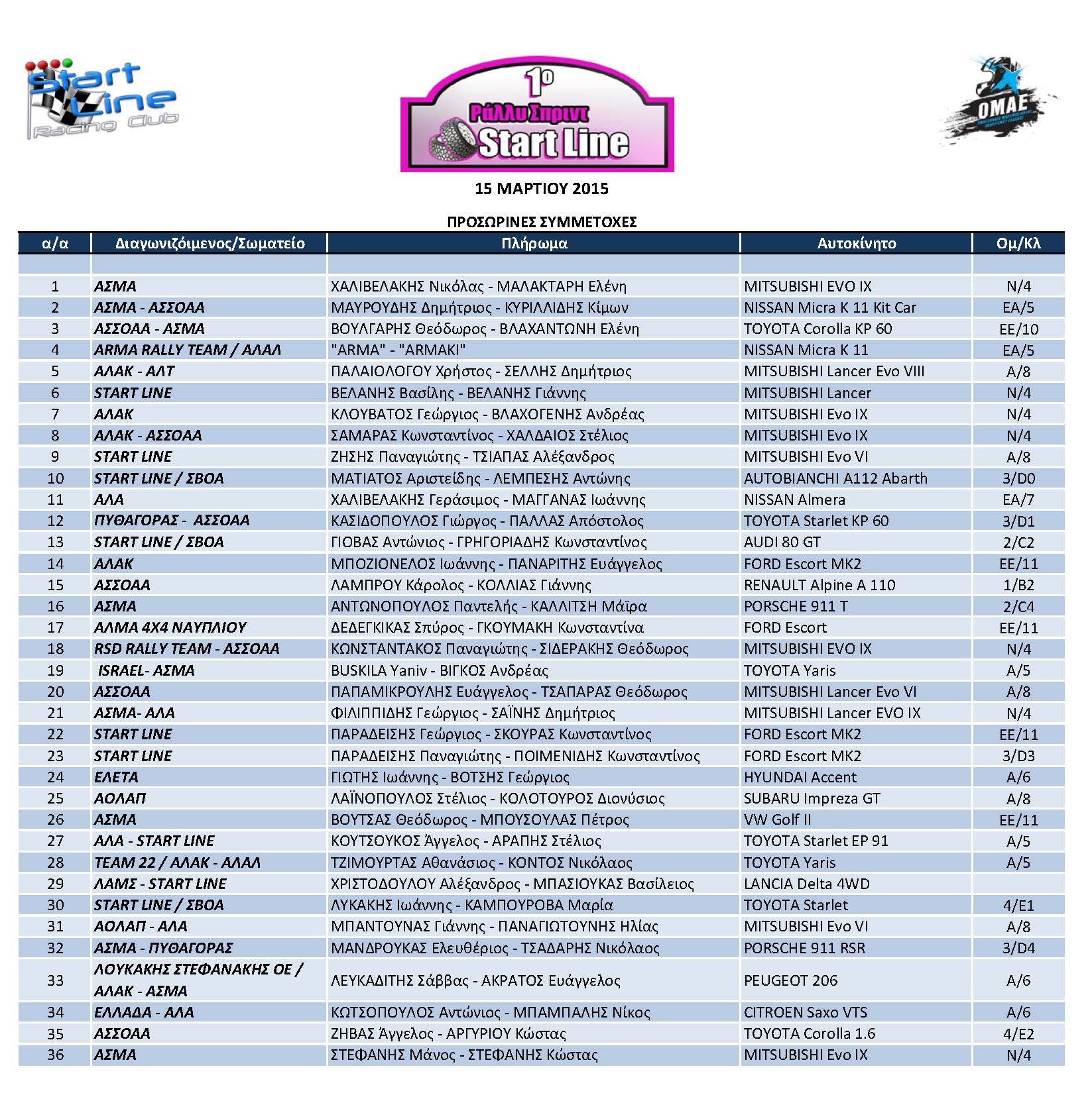 Είναι όλα έτοιμα για το 1ο Ράλλυ Σπριντ START LINE που θα ξεκινήσει το πρωί της Κυριακής με 38 πολύ ενδιαφέρουσες συμμετοχές που αναμένεται να προσφέρουν θεαματικά περάσματα από την άψογα προετοιμασμένη ειδική διαδρομή «Κινέτα-Λουτράκι».